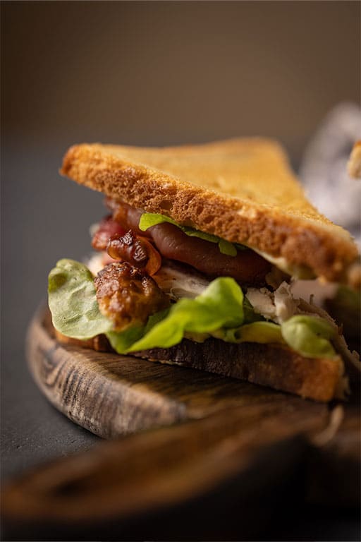 Sandwich préféré : un bon classique avec du pain toasté dans du beurre, du poulet, du bacon grillé, de la laitue et de la tomate. Le twist ? Une mayonnaise poivrée pour relever le tout : simple mais efficace !