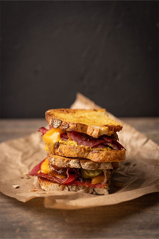 Sandwich préféré : un beau pain de campagne badigeonné de moutarde qui contient un pastrami et sa croûte de poivre, du cheddar affiné, des oignons confits et des cornichons.