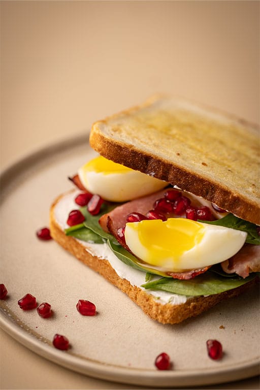 Sandwich préféré : un pain sans gluten bien grillé, un œuf bénédicte caché sous une avalanche de sauce hollandaise avec son chapeau de bacon caramélisé au sirop d’érable.